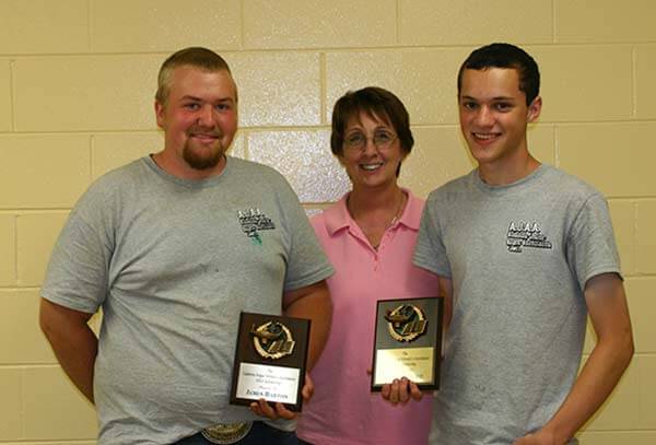 James Barton, Dutton, AL., left; and Clayton McGuire, Waverly, AL, right, received the Alabama Angus Auxiliary Scholarship winners at the 2013 Alabama Angus Association Field Day and Junior Preview Show, May 31 - June 1 in Cullman, AL Pictured presenting the awards is Debbie Graydon, Alabama Angus Auxiliary, President.