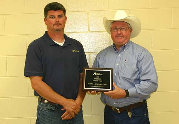 John Harrell, Hayneville, AL, right, was named Progressive Breeder of the Year at the 2013 Alabama Angus Association Field Day and Junior Preview Show, May 31 - June 1 in Cullman, AL. Philip Gleason, Alabama Angus Association President is pictured presenting the award.