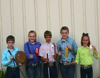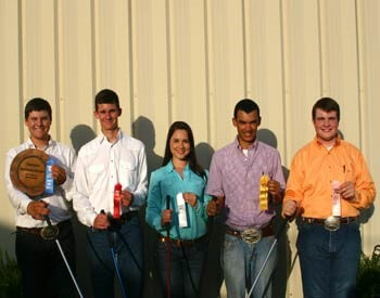 These junior members won Intermediate Showmanship honors at the 2013 Alabama Angus Association Field Day and Junior Preview Show, May 31 - June 1 in Cullman, AL. Pictured from left are Charles Langley, First, and Chandler Langley, Second, both of Camp Hill, AL; Paige Crowell, Elrod, AL, Third; Reid McGuire, Waverly, A:, Fourth; and William Graves, Cleveland, AL, Fifth.
