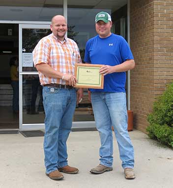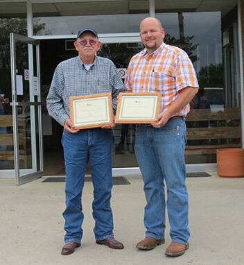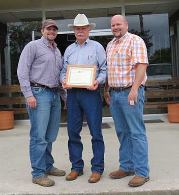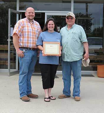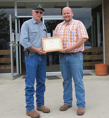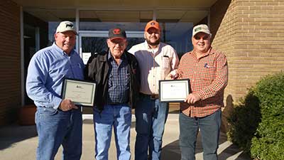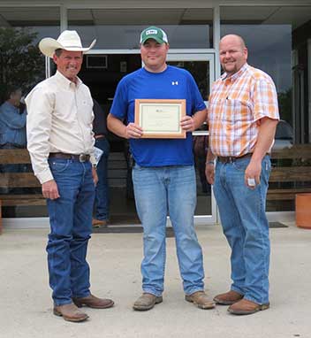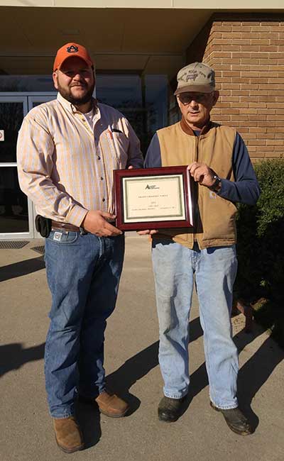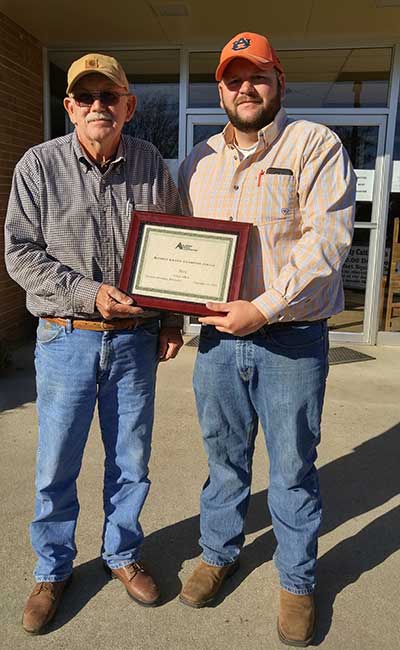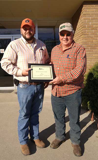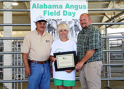 Steve and Jennifer Lee, Emuckfaw Creek Farm, Daviston, AL, were named 2015 Breeder of the Year. Pictured from left are Steve and Jennifer Lee, recipients; and George Richburg, Alabama Angus Association President, presenting the award.Fall Sale Highlights