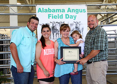 Roland and Janet Starnes, Hayneville, AL, were named 2015 Family of the Year. Pictured from left are John, Randa, Janet and Harper Starnes; and George Richburg, Alabama Angus Association President, presenting the award.